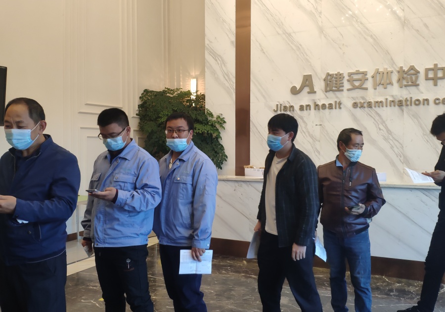 與往年體檢不同的是,今年出于新冠疫情防控的需要,員工需佩戴好口罩,提供健康綠碼,體溫測量顯示正常后方可進入體檢中心進行檢查。