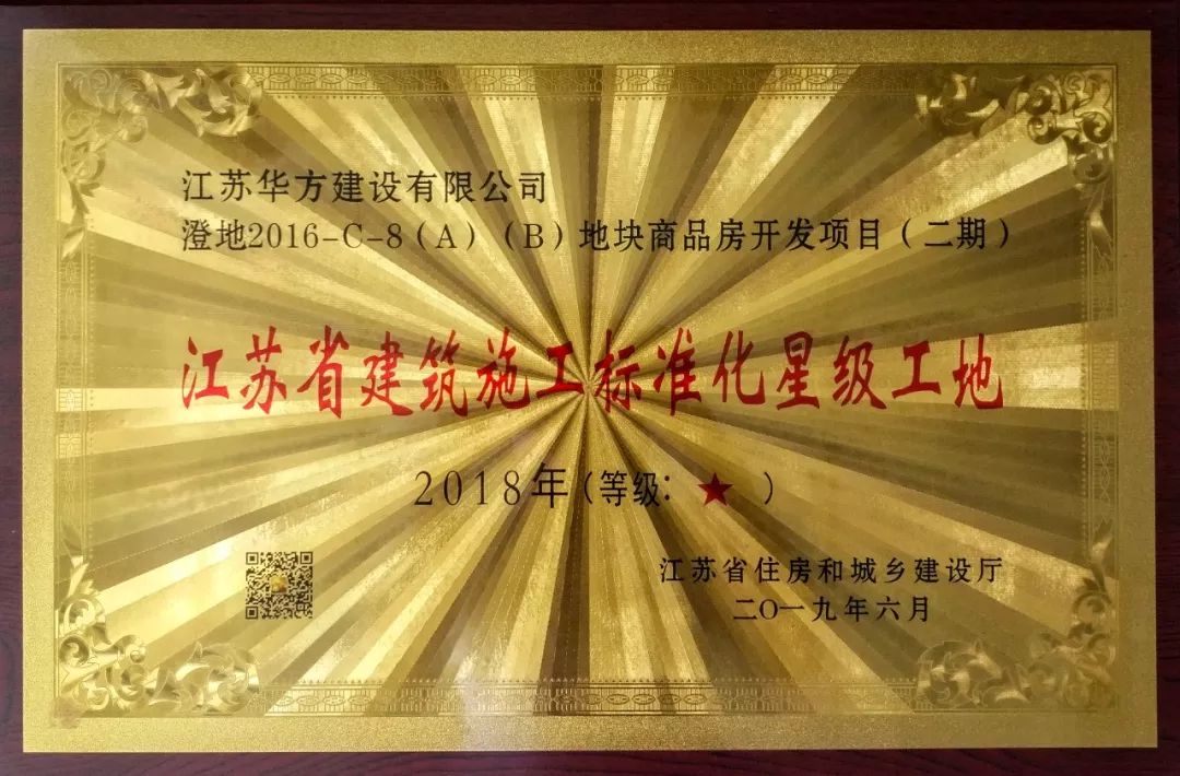 江蘇華方建設(shè)有限公司澄地2016-C-8(A)(B)地塊商品房開發(fā)項(xiàng)目(二期)榮獲2018年“江蘇省建筑施工標(biāo)準(zhǔn)化星級(jí)工地”稱號(hào)。