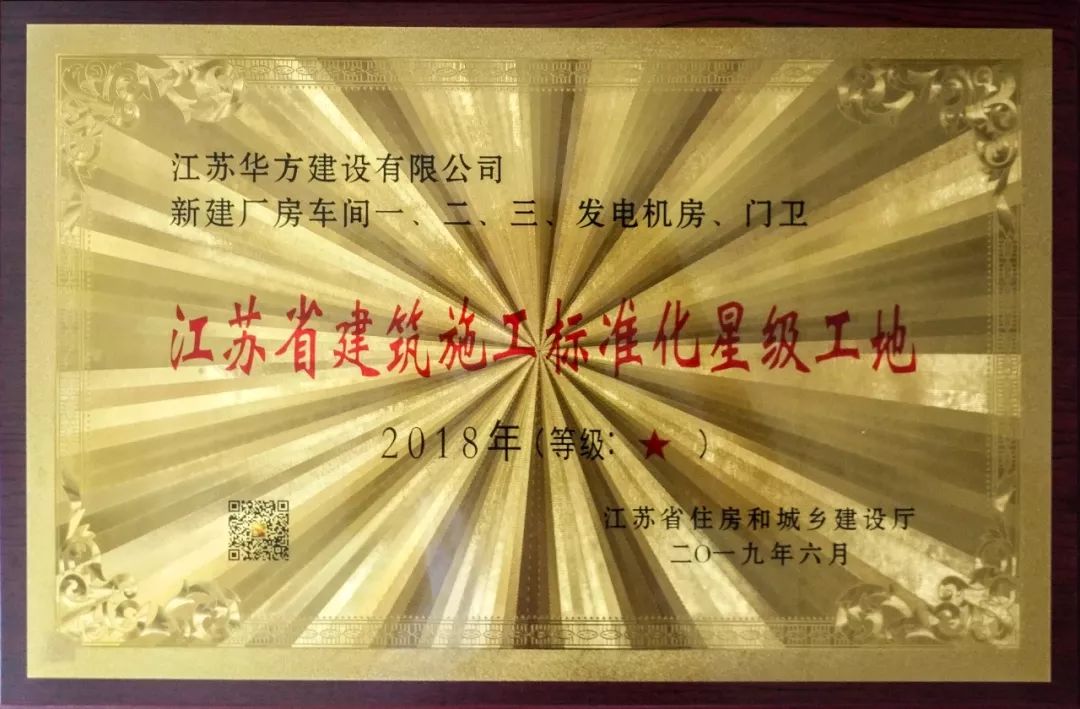 江蘇華方建設(shè)有限公司新建廠房車間一、二、三、發(fā)電機(jī)房、門衛(wèi)項(xiàng)目,榮獲2018年“江蘇省建筑施工標(biāo)準(zhǔn)化星級(jí)工地”稱號(hào)。