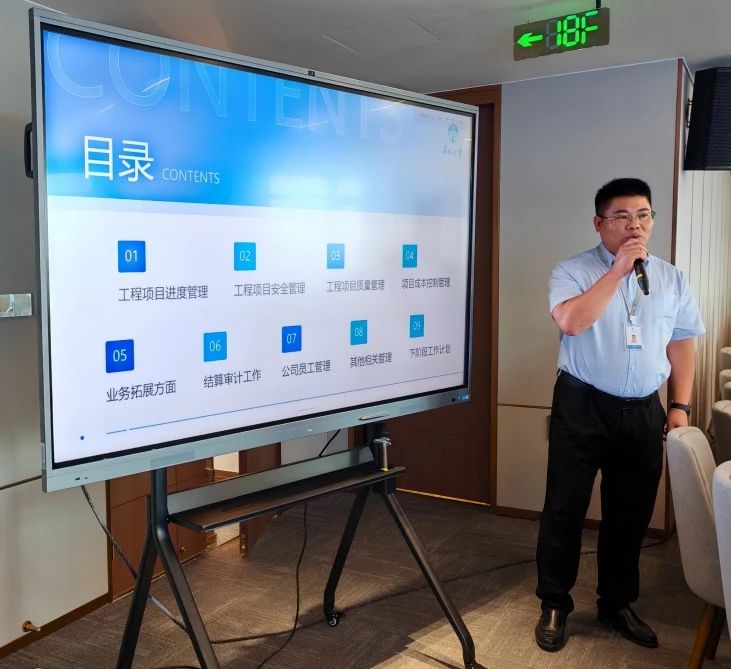 陶總首先回顧上半年工作內容,按照工程項目進度管理、安全管理、質量管理、成本控制管理、業務拓展、結算審計工作、公司員工管理、其他相關管理幾個方面進行匯報,同時對下階段的工作計劃進行了分享。