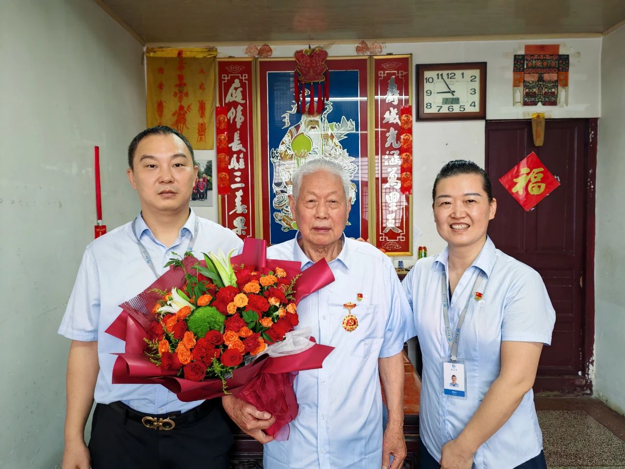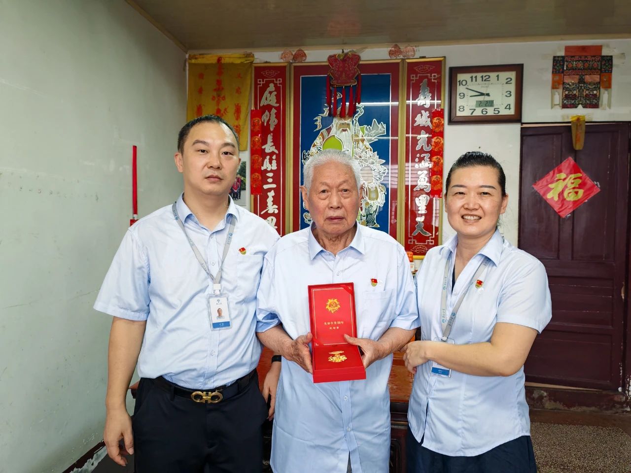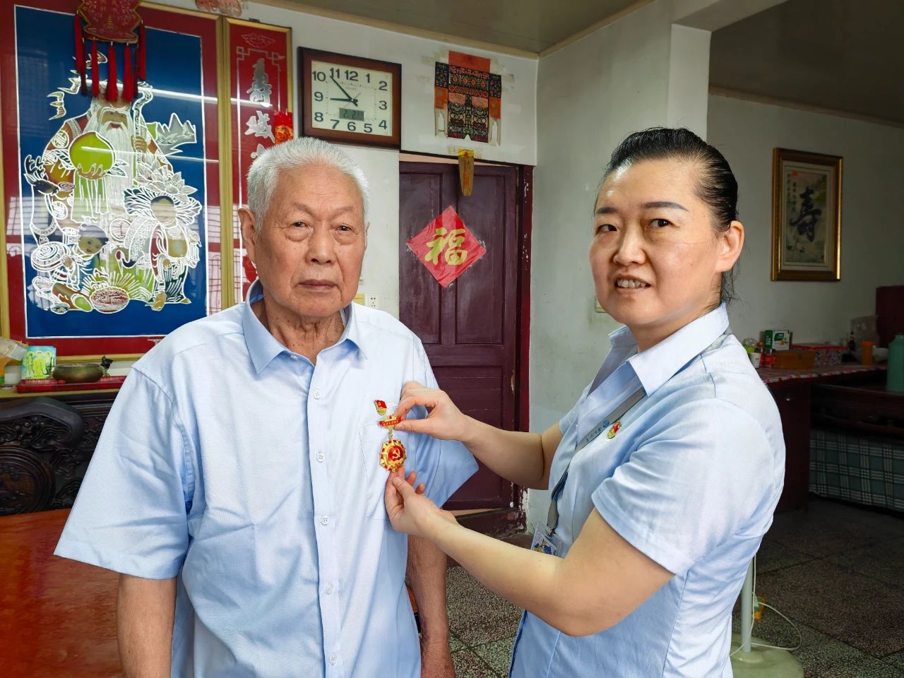 在華建照同志家中,華方企業(yè)黨支部一行鄭重地將承載著五十年忠誠的紀(jì)念章交到華建照同志手中,老人布滿歲月痕跡的手微微顫抖,眼中泛起欣慰的光芒。